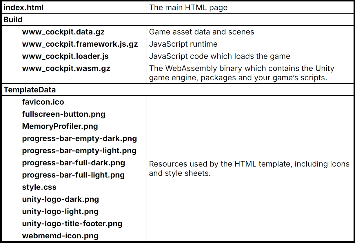 • www_cockpit.data.gz is a single download containing all the asset data that’s included in your game including scenes, meshes, textures, and audio. For more complex and resource rich games, this file can become large and it needs to be completely downloaded before the game starts. In this case, consider using the Addressables system to split your assets into smaller files that are downloaded on demand.