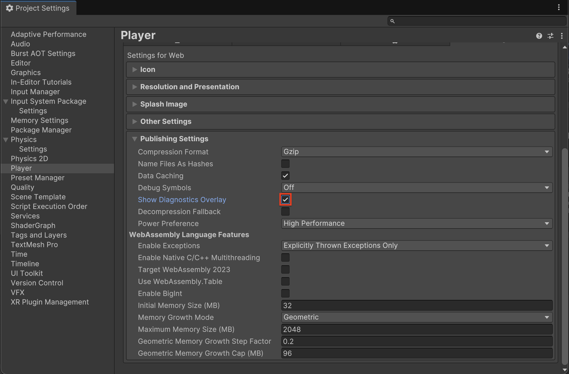 2. Use the foldout (triangle) to open the Publishing Settings section and enable Show Diagnostics Overlay.