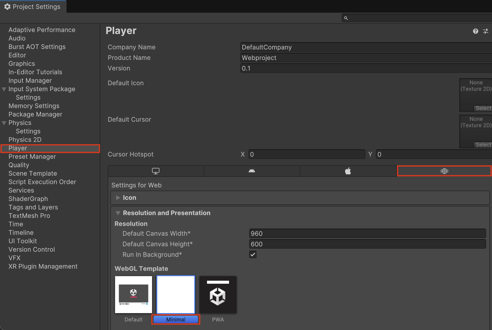While the Unity player for all other platforms either creates full-screen games or renders the game to a window, the Unity game is embedded into the web page and renders to the <canvas> HTML element. The Web template (distinct from a Unity project template) consists of the HTML, CSS, and icons that form the rest of the web page. This step will show you where to find the Web template settings and will discuss different template options.