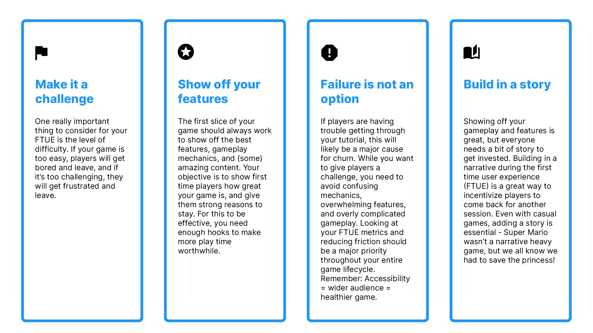 In this section we’ll walk through the FTUE basics, and explore some easy ways to keep players interested in your game early on.