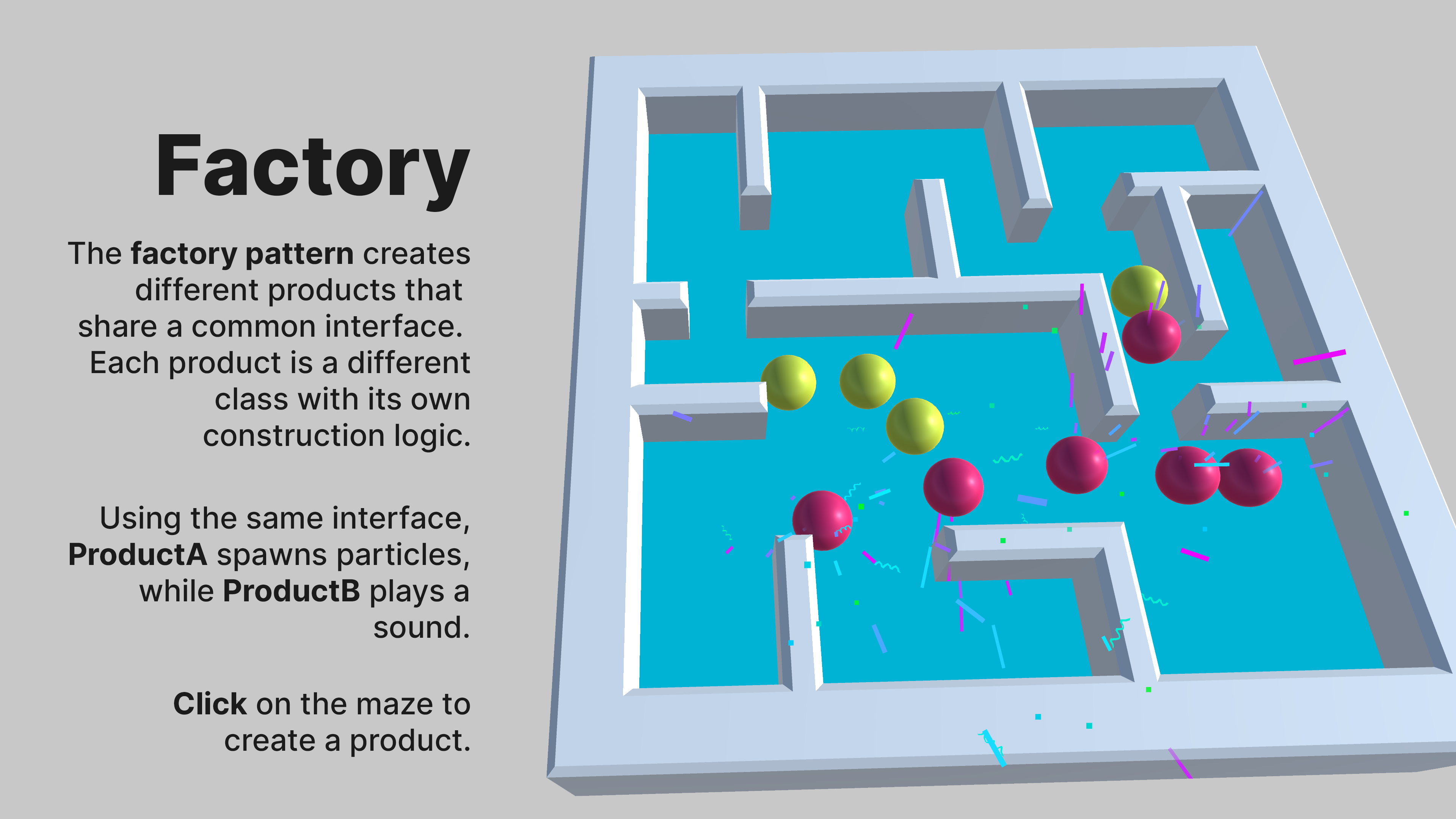 The factory pattern sample consists of code for a player to move around a maze. In the maze, you can spawn two different GameObjects called products by clicking. They both use the same interface and share a similar shape, but one spawns particles and the other plays a sound.