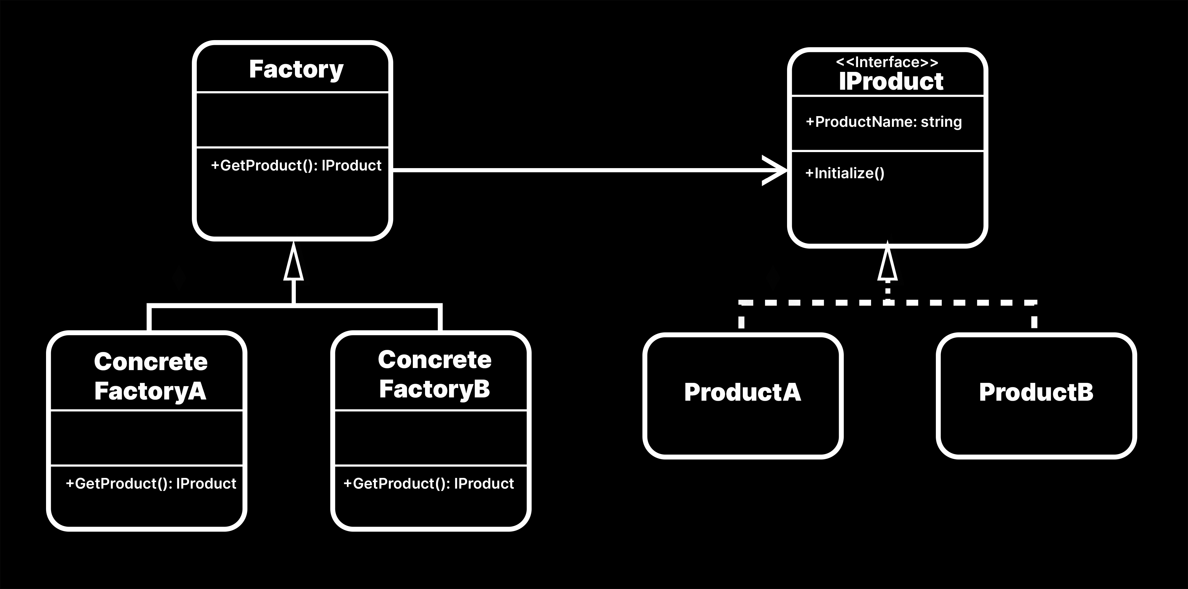 The base class, Factory, has a GetProduct method that returns an IProduct. It’s abstract, so you can’t make instances of Factory directly. You derive a couple of concrete subclasses (ConcreteFactoryA and ConcreteFactoryB), which will actually get the different products.