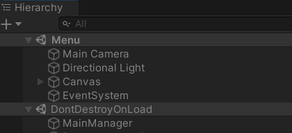 Whoops, there are now two MainManager GameObjects! This happens because the MainManager traveled with us from the Main scene back to the Menu, where the original instance of the MainManager is located. This can cause problems later down the road — let’s fix it next.