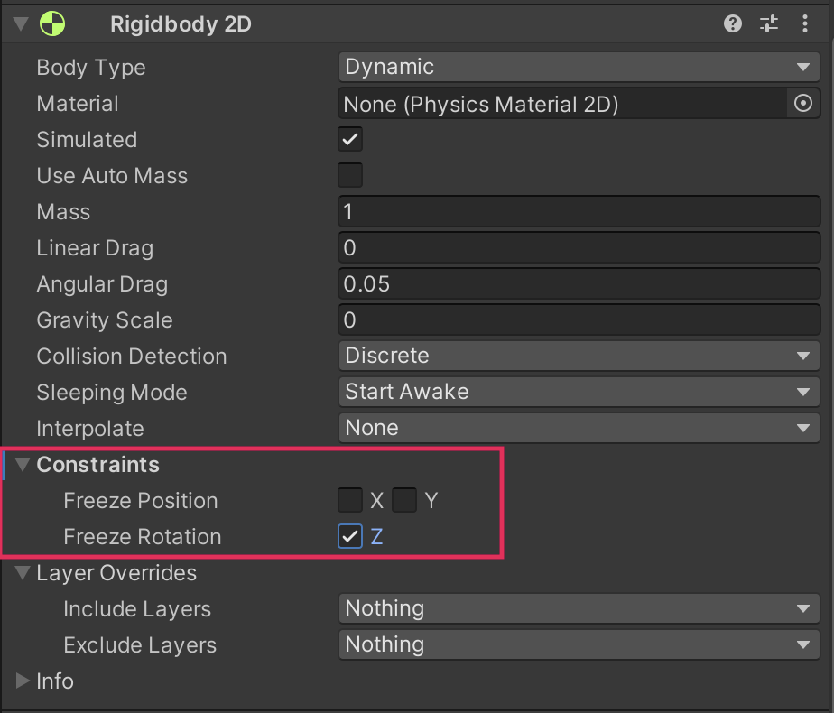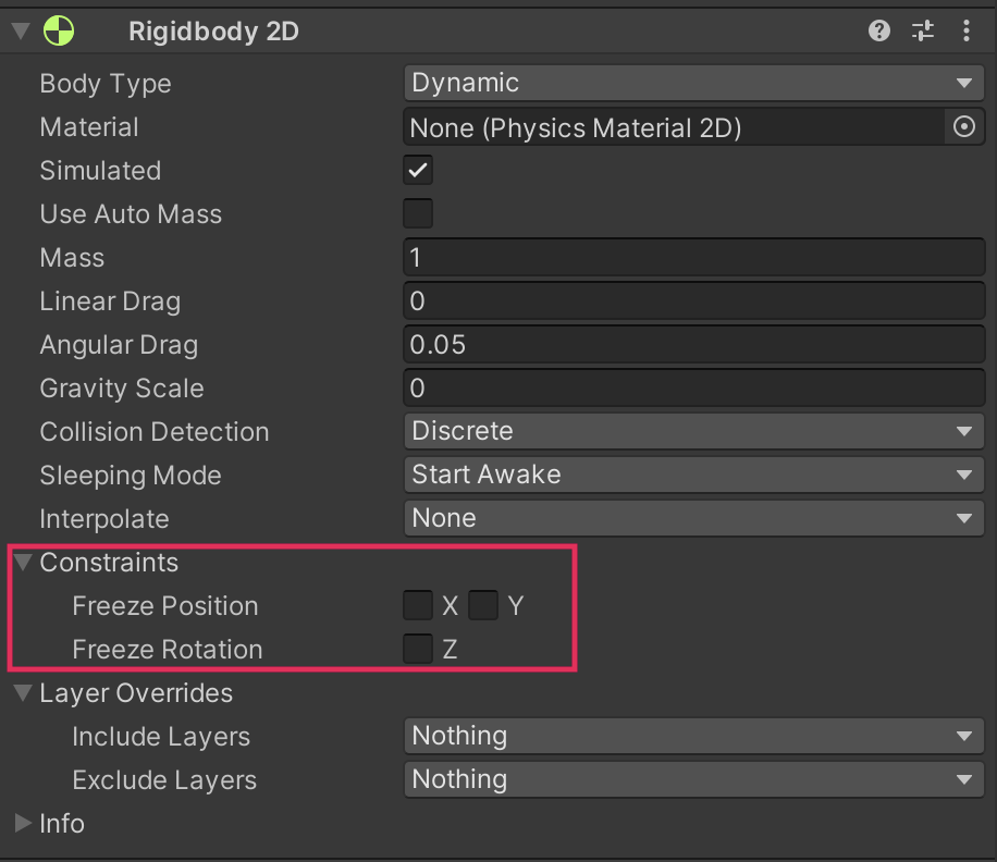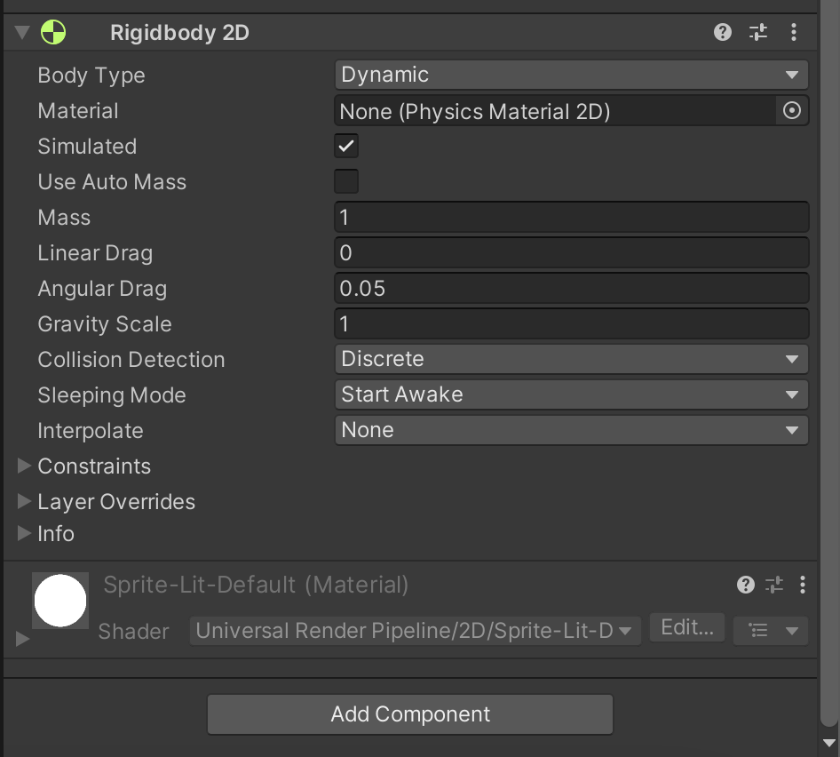 2. In the Inspector window, find the Rigidbody2D component.