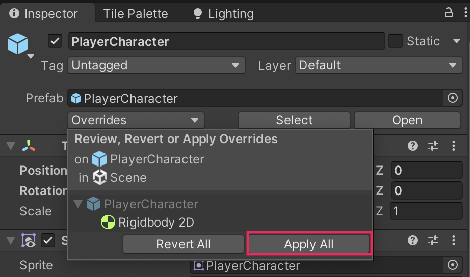 Notice that a vertical blue line is now present next to the Gravity Scale property — this is because you have made changes to the prefab instance for the PlayerCharacter GameObject rather than the prefab asset itself.