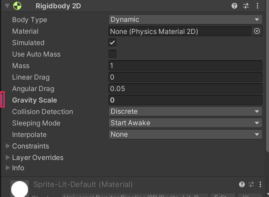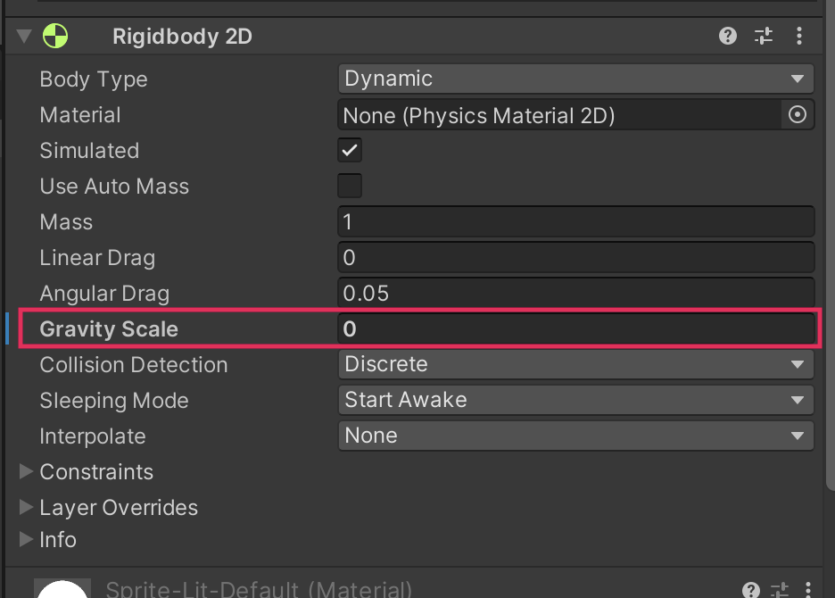 2. In the Inspector window, under the Rigidbody 2D component, set the Gravity Scale property to 0.