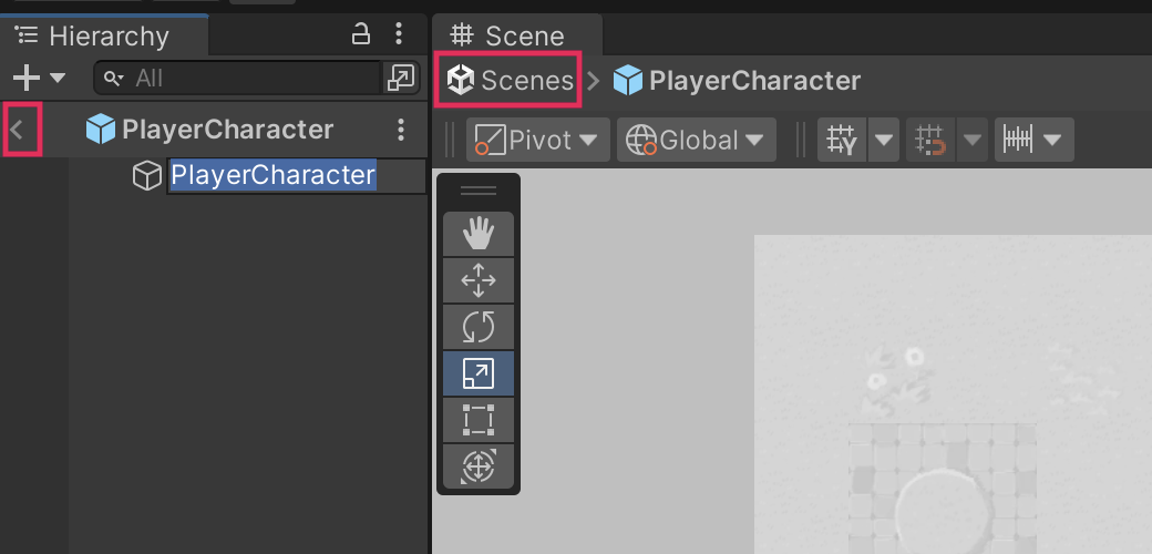 6. To exit prefab editing mode, select Scenes in the breadcrumbs in the upper-left corner of the window, or select the arrow to the left side of the PlayerCharacter prefab.
