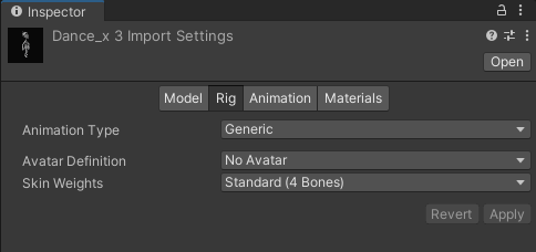 1. With the Dance_x3 fbx file still selected, in the Inspector, select the Animation tab to reveal the animation import settings.