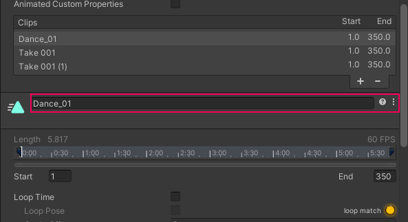 4. Select the first clip labeled Dance_x3 to select it in the clip editing section below Clips and rename the Dance_x3 clip to Dance_01.