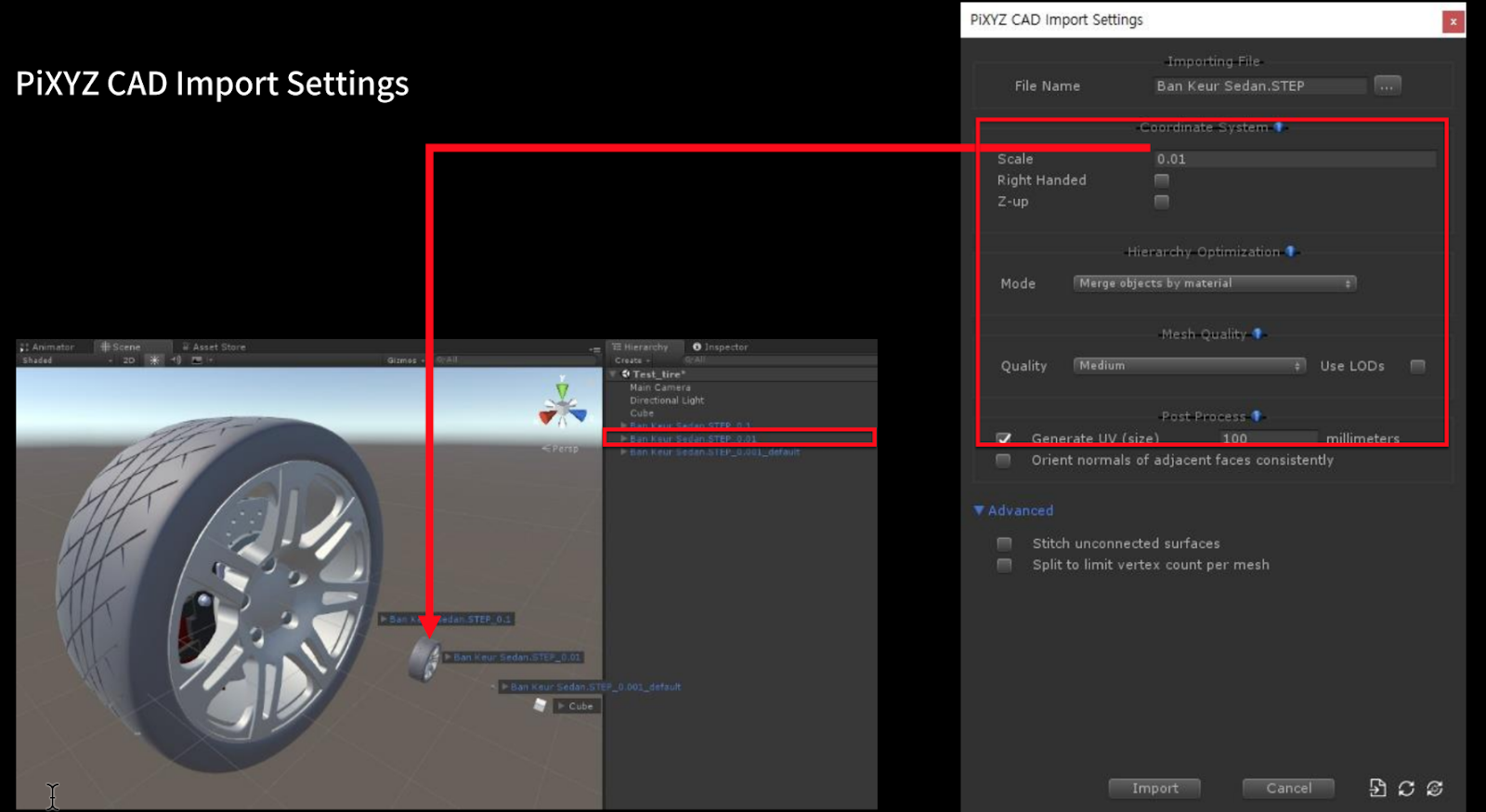 • Use PiXYZ>Import CAD and then select the wheel model that you’ve downloaded.