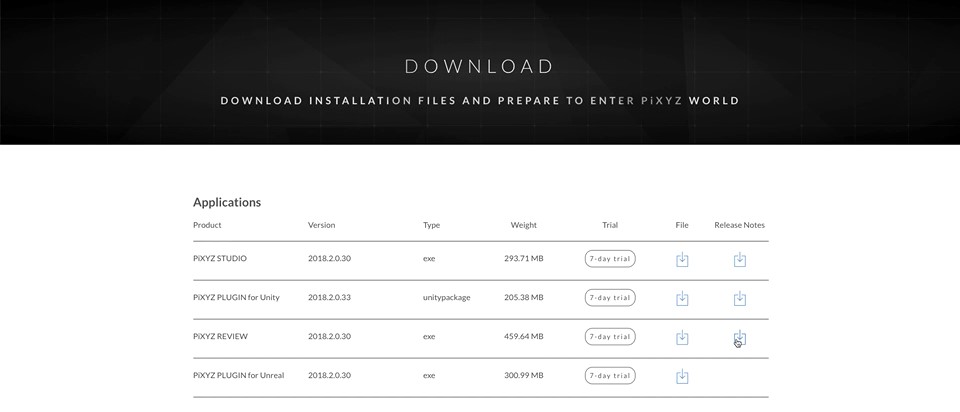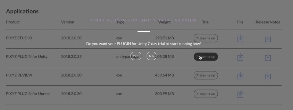 • Visit the PiXYZ website and download the plugin and activate a 7-day trial (for compatibility with Unity 2017.4.10 download a version prior)
