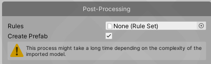 PiXYZ can create a Prefab from the imported model, and — using Live Sync — update the Prefab when changes are made to the imported model outside of Unity. Additionally, a RuleSet can be applied to the imported model. A RuleSet can be used to automatically stage or optimize your imported model. For more information about the Rule Engine and RuleSets, see the PiXYZ Plugin Manual.