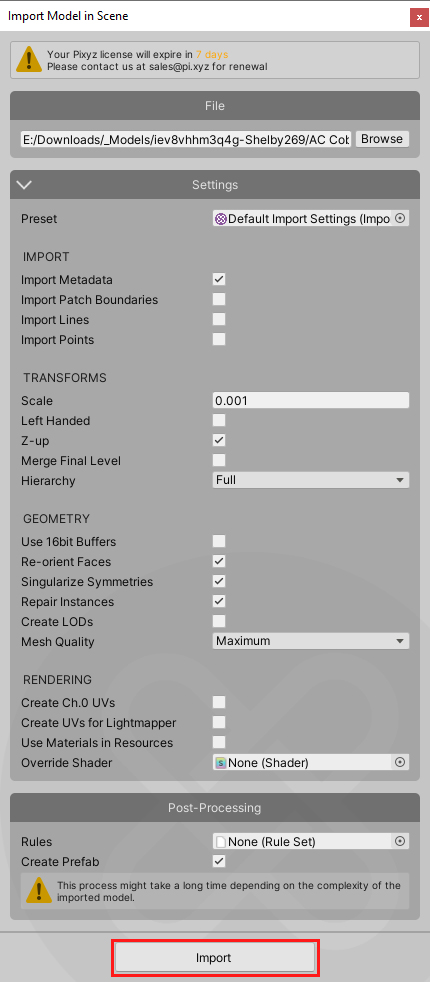 The settings that work best for you and your project will vary based on many factors, from software used to target platform. Mastering them will greatly reduce the time and effort involved in importing assets with PiXYZ Plugin.