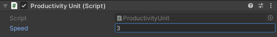 7. Add the ProductivityUnit script to the Prefab. Notice that because the class is a child of Unit, it’s automatically given a public float variable to control its speed.