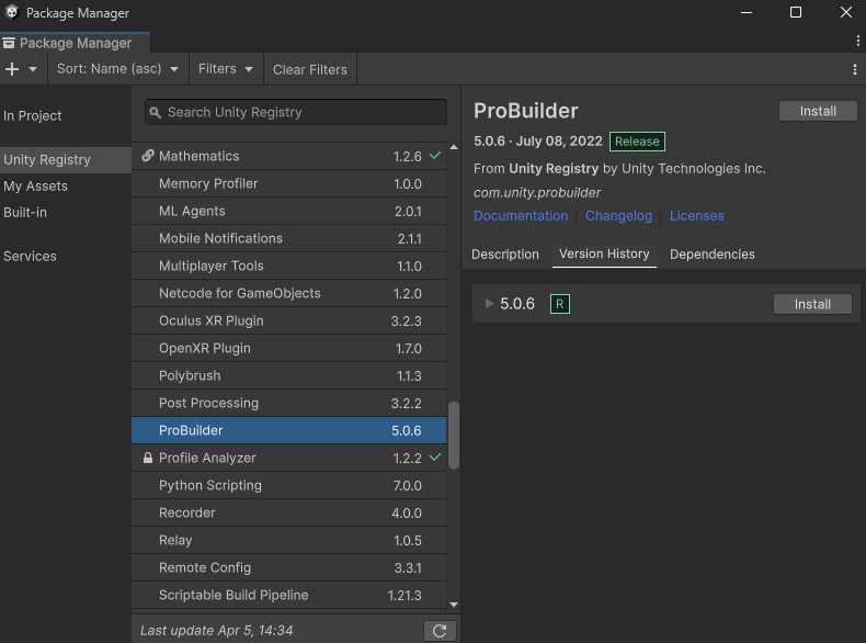 3. Locate and select the ProBuilder package item, then select the Install button.