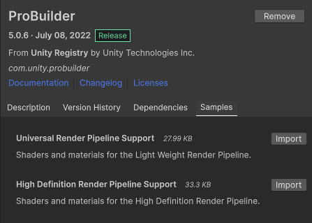 After installing ProBuilder, the Samples tab is added to the ProBuilder package in the Package Manager. Select this tab and install the correct support needed for the render pipeline of your project. The new materials will be set as default after installation.