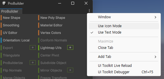 When you open the ProBuilder window, you’ll see the list of tools available. If you prefer, you can switch these names to icons by selecting the More (⋮) button followed by Use Icon Mode.