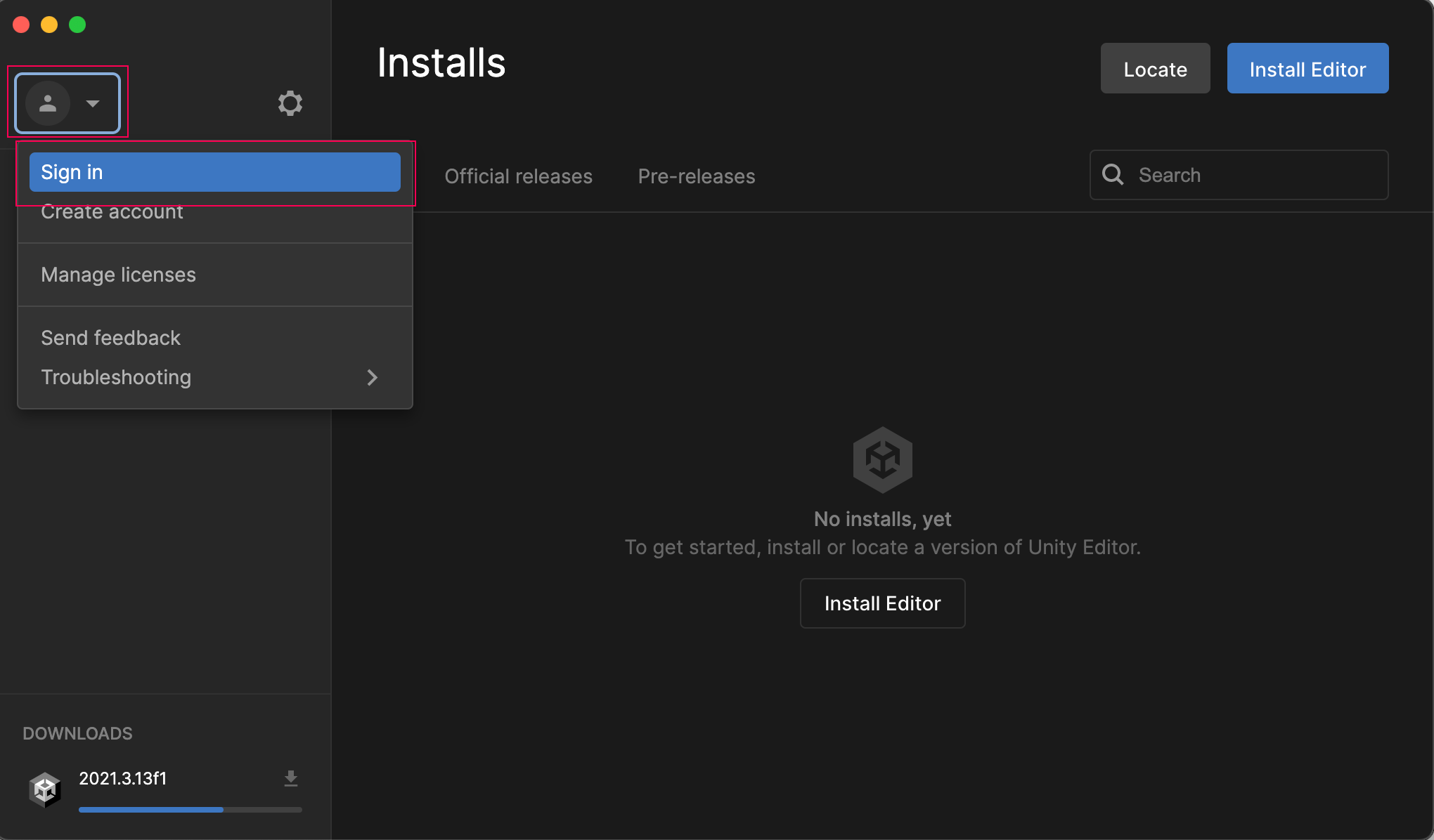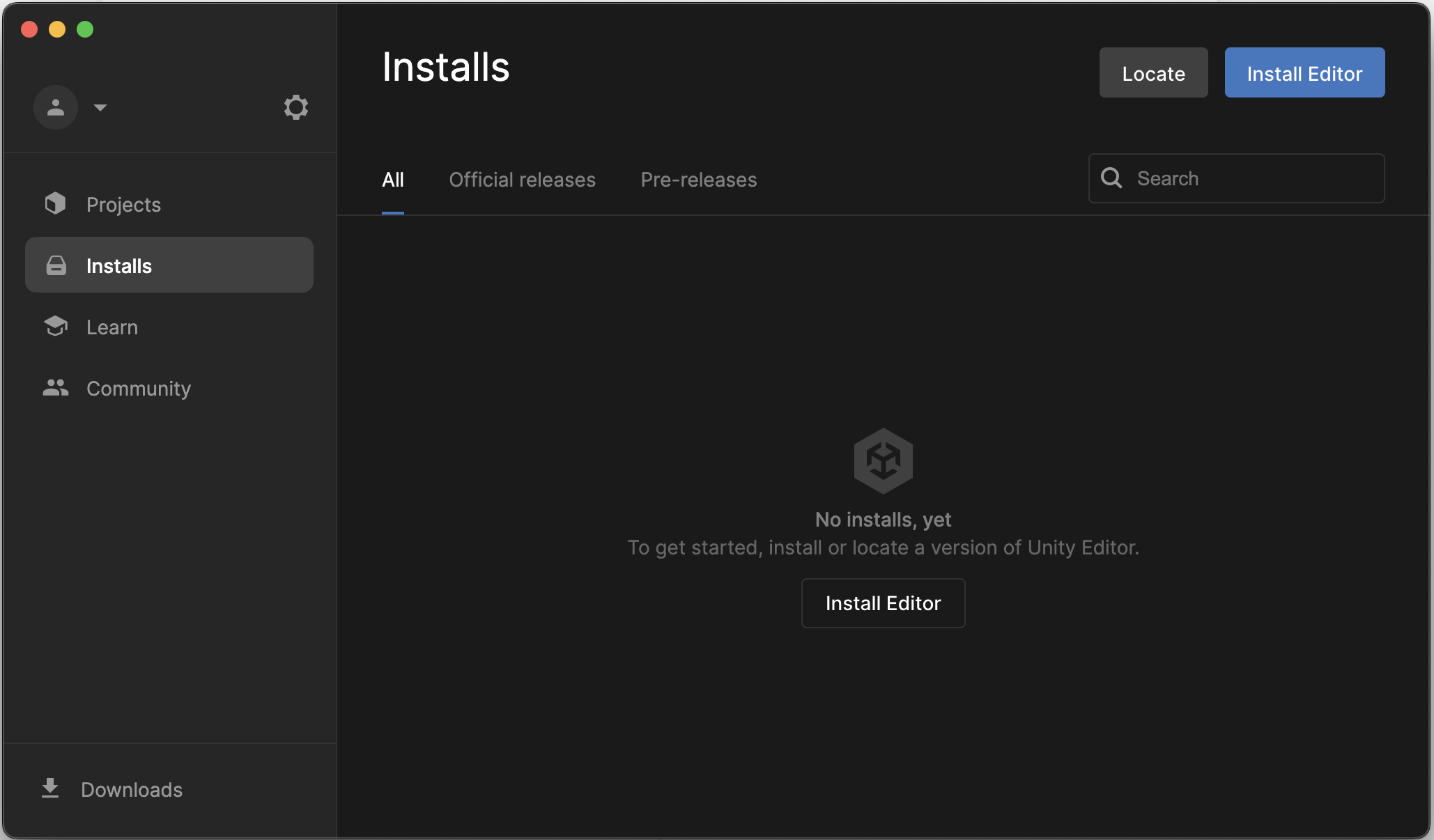 - Open Unity Hub for the first time and click on the tabs along the left side to explore it.