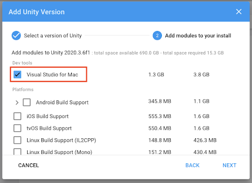 3. On the Add modules screen, select Visual Studio (for Mac or PC).