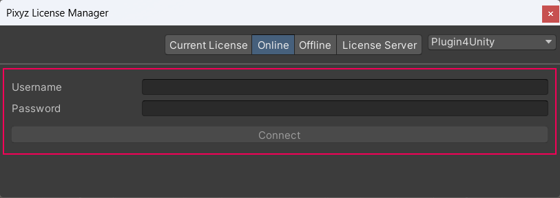 3. Enter your PiXYZ account login details. The field labeled Username is actually expecting the e-mail address associated with your PiXYZ account. Click Connect.