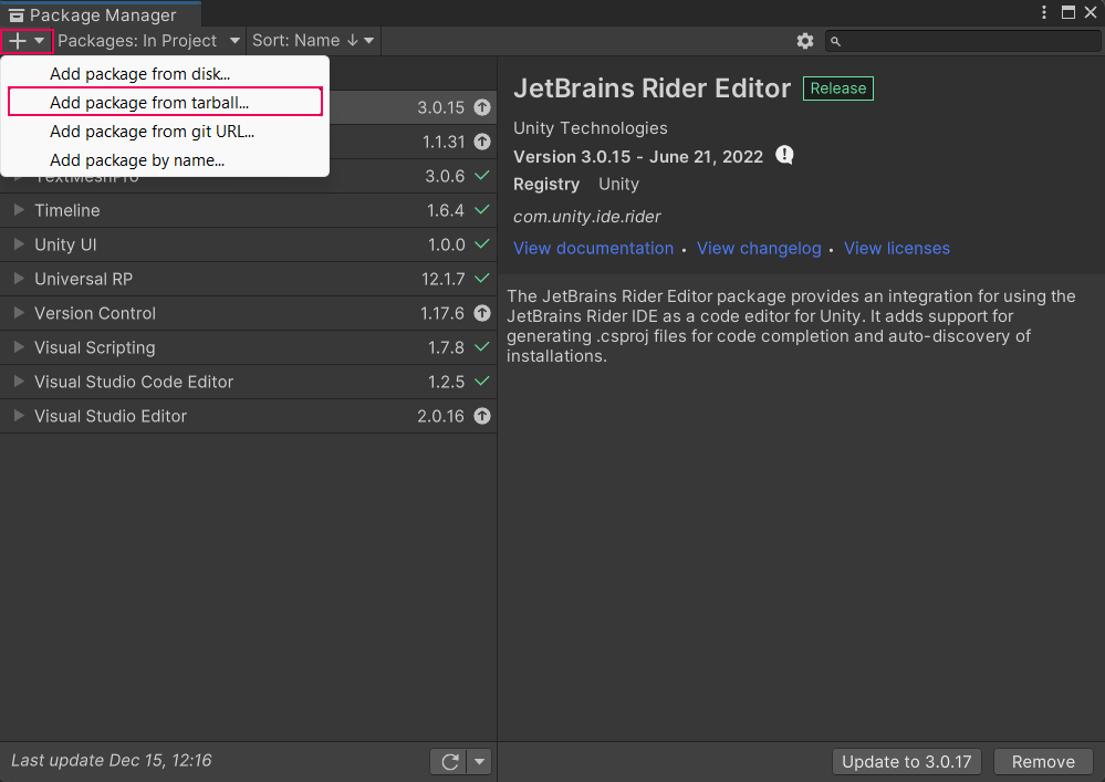 3. In the Package Manager window, click the Plus symbol (+) in the menu bar, then from the drop down, select Add package from tarball.