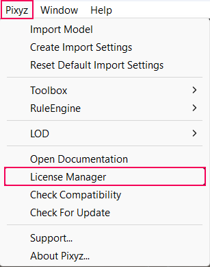 5. Notice that there’s now a PiXYZ entry in the menu bar. Most of PiXYZ’s functions are accessed via this menu.