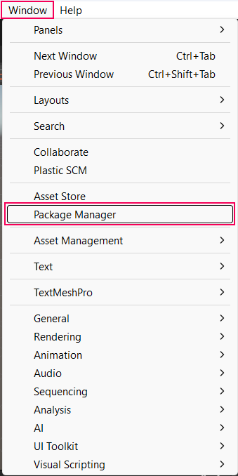 2. In the Unity Editor, from the main menu, select Window > Package Manager.