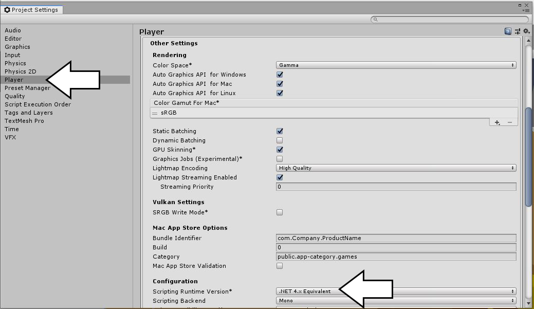 - In the Player settings panel expand Other Settings.