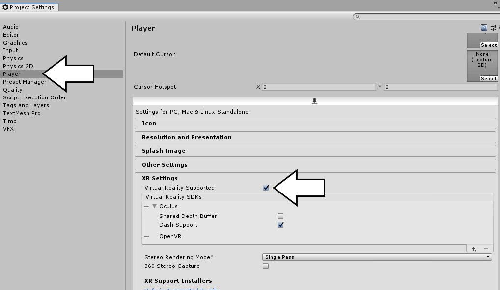 - In XR Settings ensure the Virtual Reality Supported option is checked.