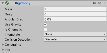 The Rigidbody Component (Figure 04), allows GameObjects to be affected by Physics properties, such as Gravity. It also includes properties for Mass, Velocity, and Drag (air resistance). Objects of larger mass are less affected by objects with lower mass and vice versa. Drag affects the dampening of velocity over time. Angular Drag affects angular velocity.