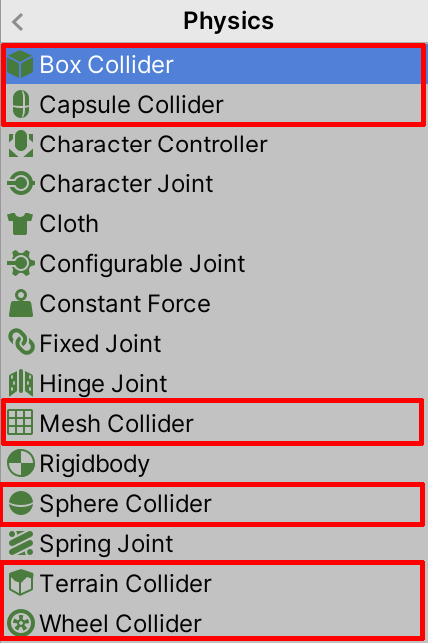 Types of Colliders include: Box Collider, Capsule Collider, Mesh Collider, Sphere Collider, Terrain Collider, and Wheel Collider (Figure 01). Note that Mesh Colliders are computationally expensive. It is best to use a “cheaper” mesh for collisions if the displayed mesh is very detailed. With ProBuilder, simpler “proxy” meshes can be built to conform to the shape of more complex meshes.