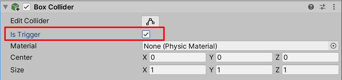 Triggers are enabled with the “Is Trigger” checkbox selected. This functions the same as a Collider, but disables Physics on the component, enabling objects to pass through it via a zone. Events can be called when objects enter or exit the Trigger (Figure 03).