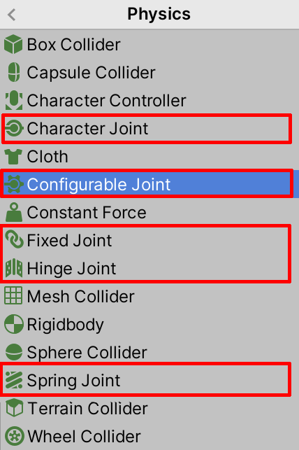 Character Joint: Emulates a joint of a character, such as a hip or shoulder joint. This constrains Rrigidbody movement along all linear degrees of freedom, and enables all angular freedoms. Rigidbodies attached to a Character Joint orient around each axis and pivot from a shared origin.