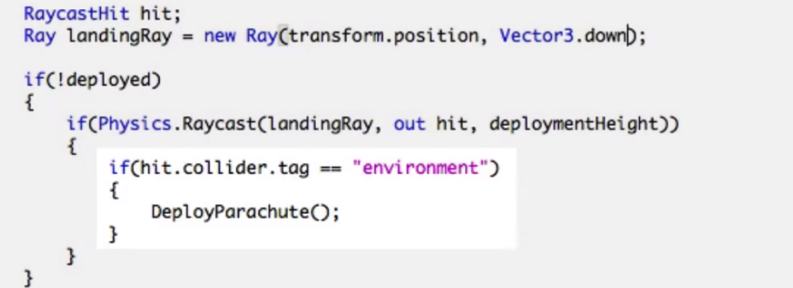 If the distance between the transform position and the floor (GameObject with the environment tag) is at deploymentHeight, call the function: DeployParachute().