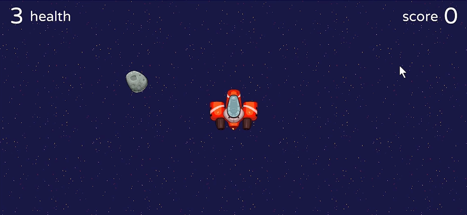 - Test the game by clicking play. When the player hits the asteroid, you will see that health drops by one point. When the points reach zero, the Game Over text appears