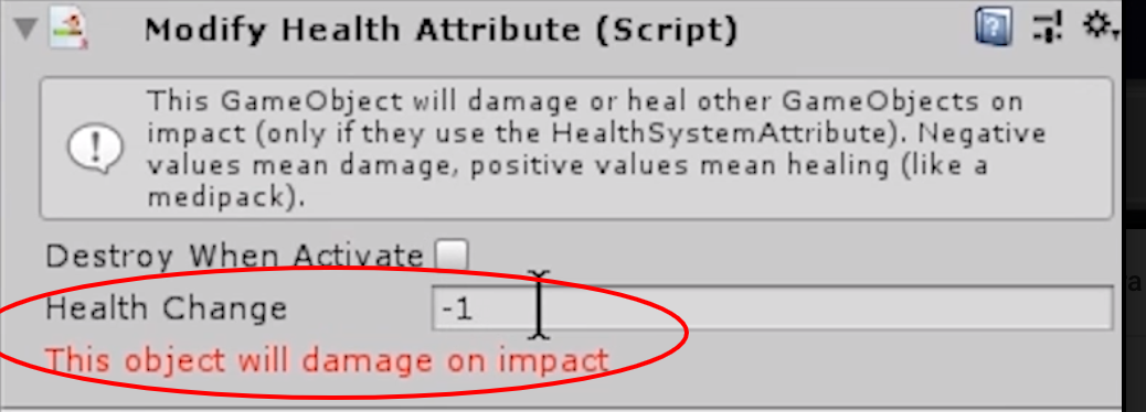 - Try introducing a GameObject that allows the player to recover points. Hint: it’s really important to use a positive value for the Modify Health Attribute script’s Health Change section