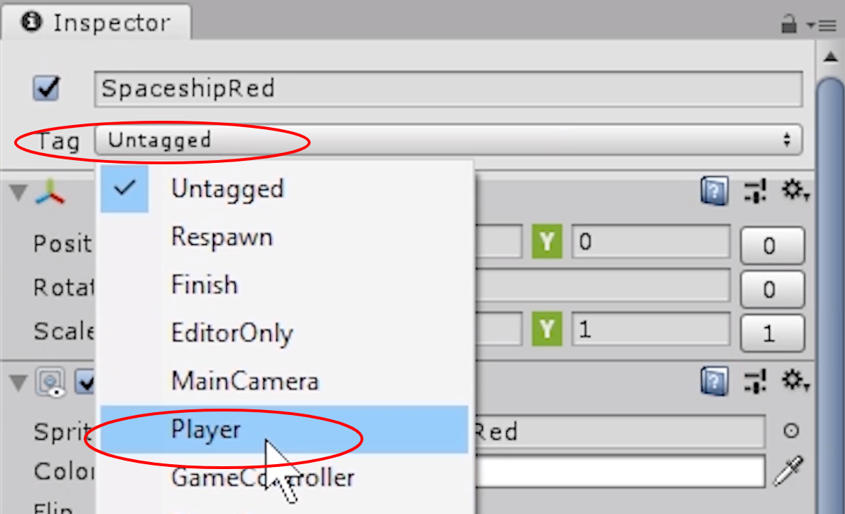 - Now, go to Hierarchy > select SpaceshipRed. Go to Inspector and change the Tag from Untagged to Player