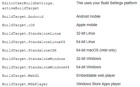 Because the required format and handling of AssetBundles varies by platform, you must specify the target platform using one of the following options: