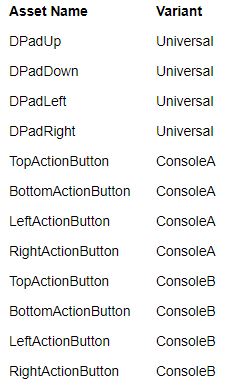To illustrate one use of variants to aid AssetBundle organization, let’s say we’re creating a tutorial level for a multi-console video game. The following table lists some of the graphics that might be used in the instructions to show the player which buttons to press. The Controller Layout is common to modern consoles, but the labeling on the action buttons varies by platform. In this example, the top action button performs the same action on both versions of the game, despite the labels being different. In our code, we’d load the Universal Variant for directional graphics, but load the variant containing the button or keyboard graphics for our specific system at runtime.