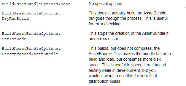 The specified AssetBundle directory must exist before the AssetBundle is built. The BuildAssetBundleOptions parameter is optional and defaults to None if nothing is specified. Some key options are:
