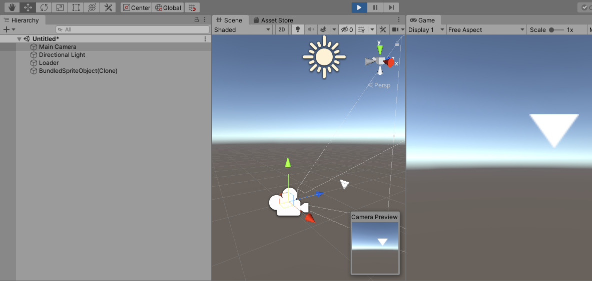11. The object that you created earlier, (in this example of an arrow Sprite,) should load instantly. Note that the BundledSpriteObject loads as a Clone during runtime. You may or may not need to position your Camera closer to bring the object into view (Figure 06)
