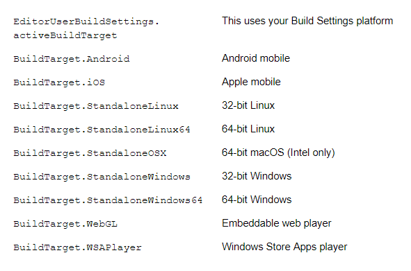 Because the required format and handling of AssetBundles varies by platform, you must specify the target platform using one of the following options: