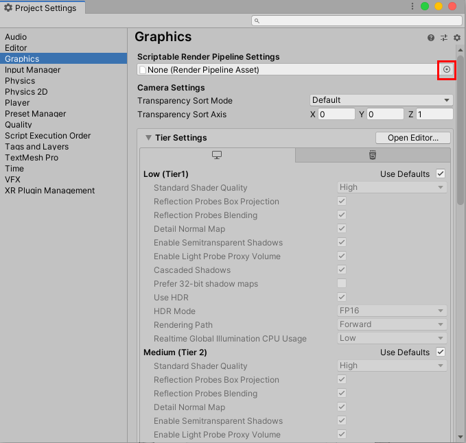 2. Edit > Project Settings > Graphics の順に進みます。
