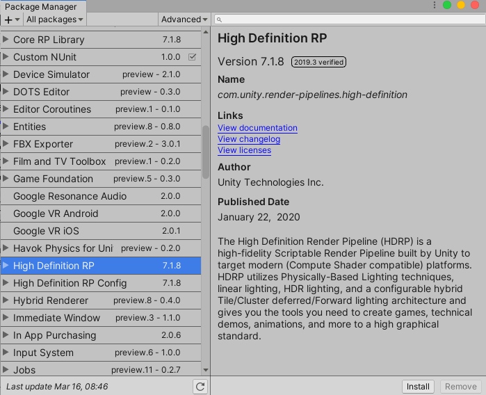 既存のプロジェクトをアップグレードするには、まず Unity のパッケージマネージャーを使って HDRP をダウンロードする必要があります。