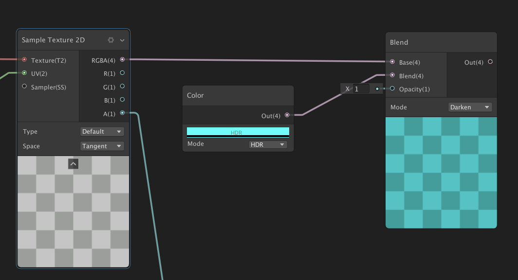 4. Connect the RGBA(4) output of the first Sample Texture2D Node to the first Base(4) Node of the new Blend.