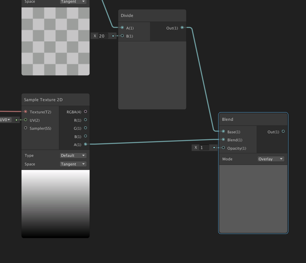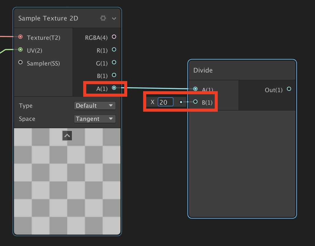 2. Drag the A(1) output of the Checker Sample 2D Node to the A(1) Divide Node input.