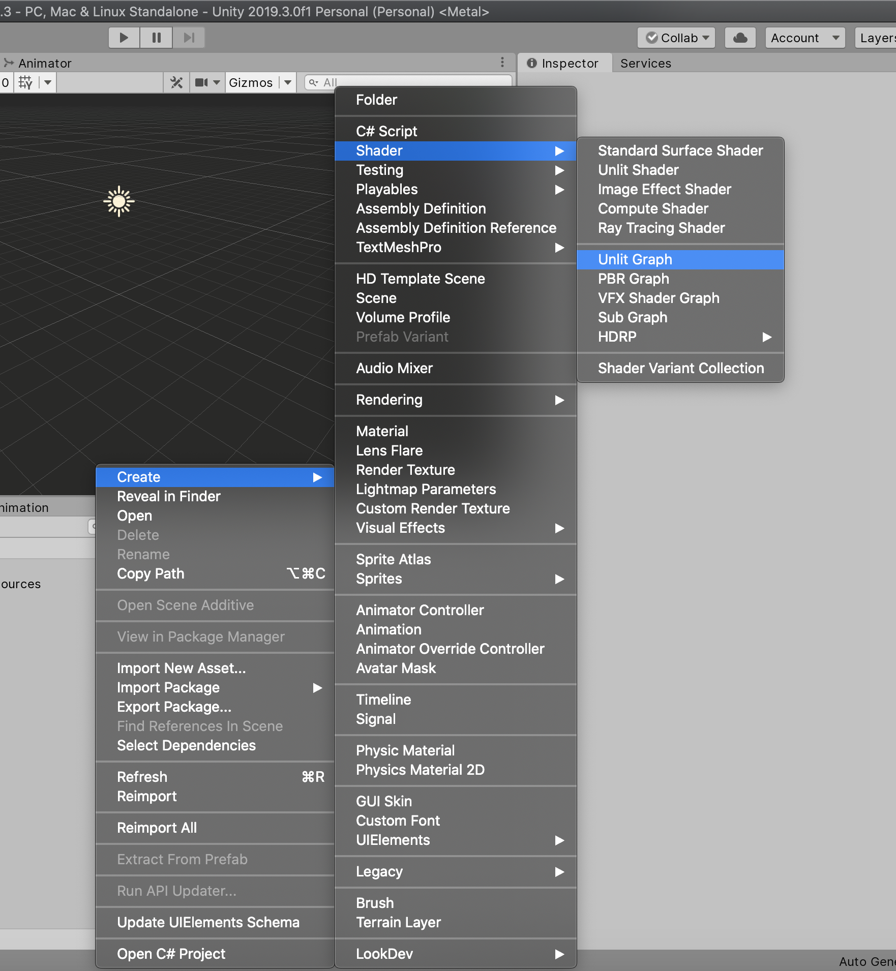 2. Right-click in the Project window and from the Create flyout, navigate to Shader and select Unlit Graph. A new Shader Graph will be generated in the Project window