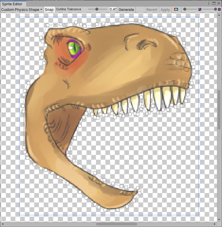 The Custom Outline tool can automatically generate a custom outline based on the opaque areas of the Sprite. You can then adjust the points manually or use the Snap button to snap it to the nearest pixel. Outline Tolerance controls how tightly the outline follows the Sprite’s Texture.