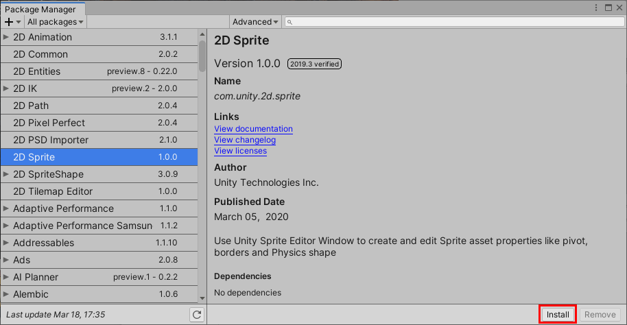 2. Click 2D Sprite in the left column, then click Install in the lower-right corner (Figure 01).