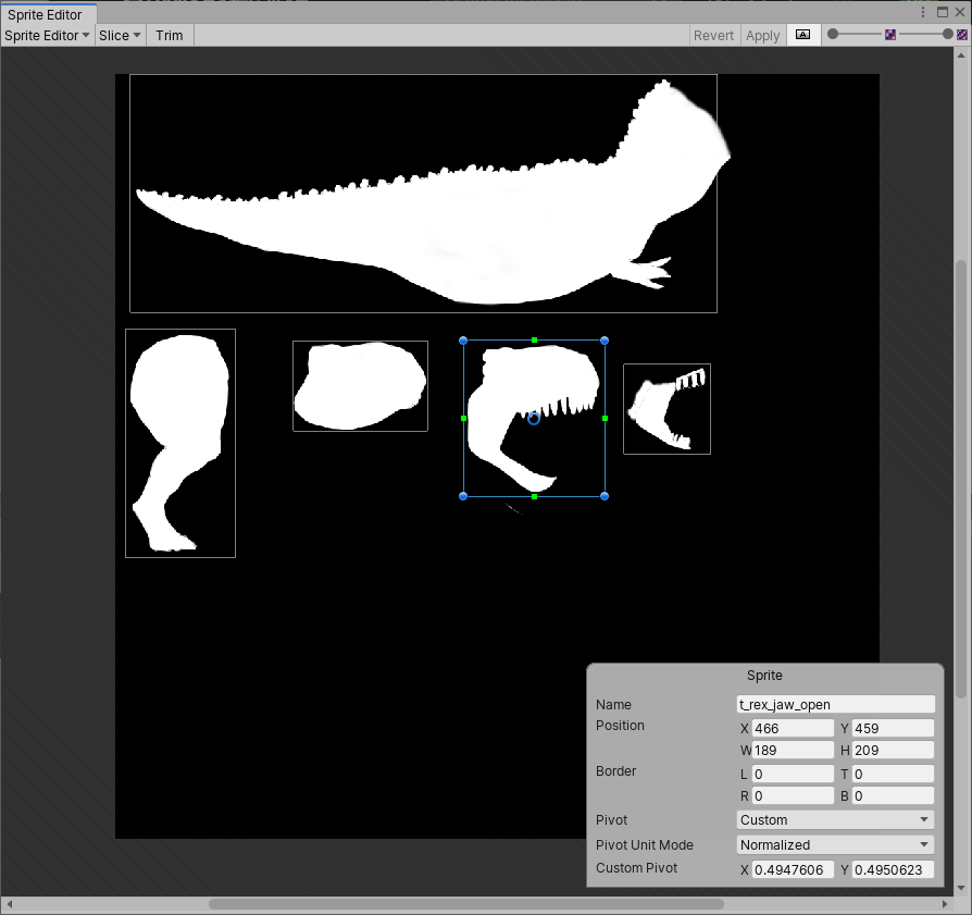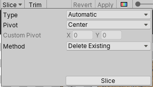 - Trim: Automatically trims a selected slice to the smallest possible size based on the Sprite’s actual size.